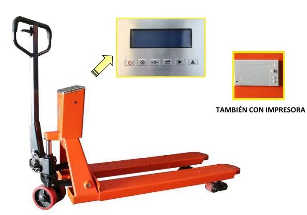 Transpaleta de pesaje con y sin impresora. Funcionamiento display con batería. Cargador externo. Tolerancia: +-0,1% Ruedas y rodillos poliuretano